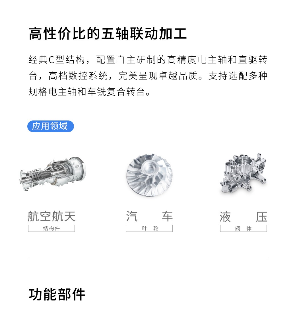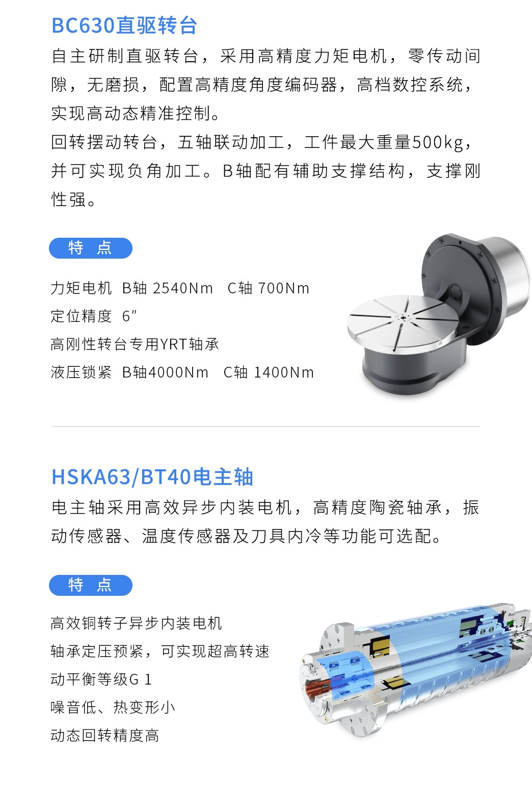 【概要描述】經典C型結構,配置自主研制的高精度電主軸和直驅轉台,高檔數控系統。支持選配多種規格電主軸和車銑複合轉台。