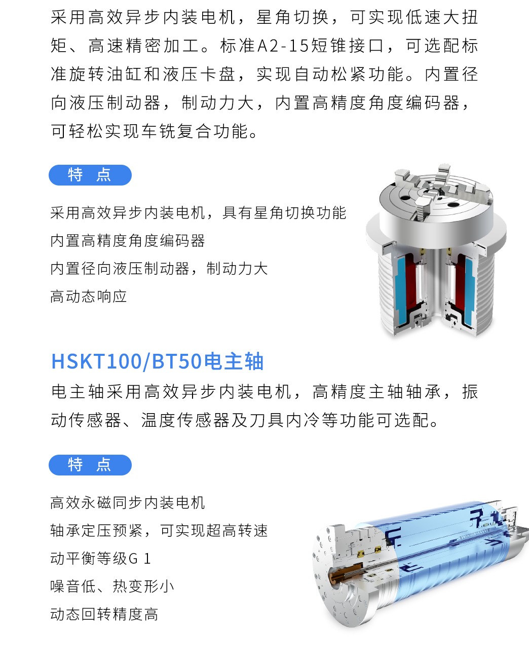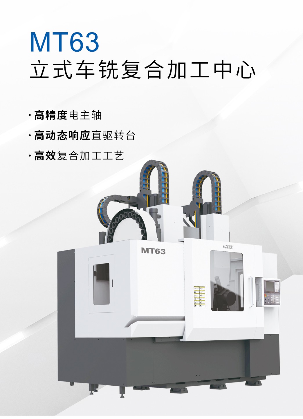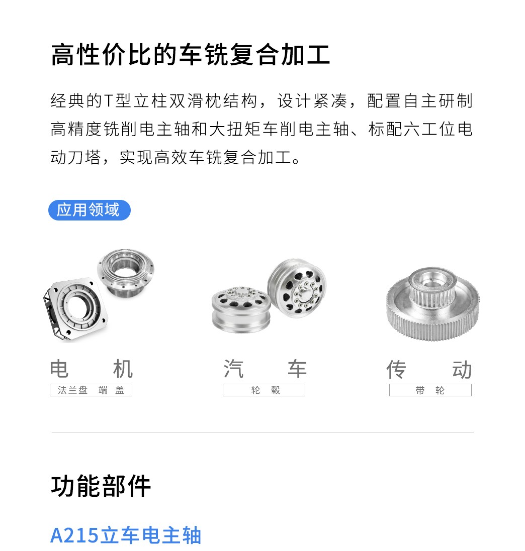 【概要描述】經典的T型立柱雙滑枕結構,設計緊湊,配置自主研制高精度銑削電主軸和大扭矩車削電主軸,标配六工位電動刀塔,實現高效車銑複合加工。