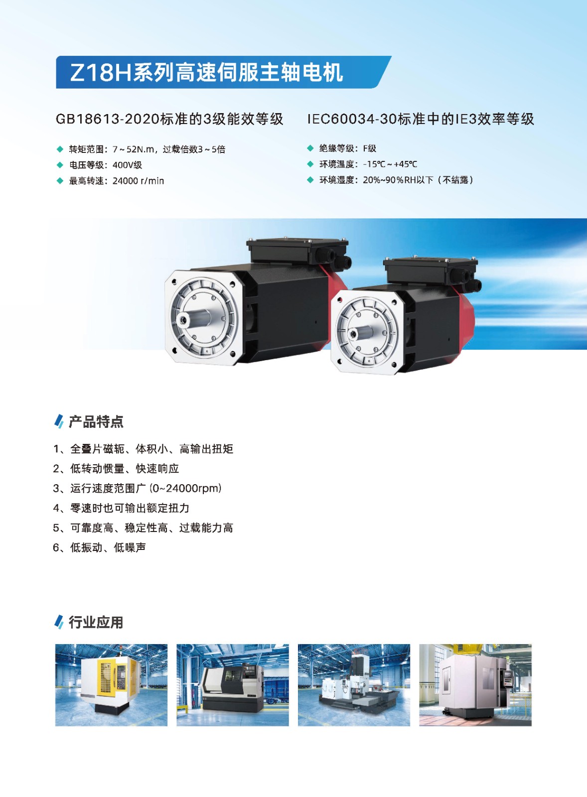 【概要描述】Z18H高速伺服主軸電機,具有全疊片磁轭、體積小、高輸出扭矩;低轉動慣量、快速響應;運行速度範圍廣0~24000rpm;零速時也可輸出額定扭力;可靠度高、穩定性高、過載能力高;低振動、低噪聲的産品特點。